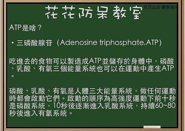 磷酸系統(ATP-PC系統):提供ATP最迅速的系統,但是大約只能維持十秒鐘就GG了,必須休息好幾分鐘才能恢復,堪稱能量系統界快槍俠(誤)。雖然磷酸先生不持久,但是非常的勇猛,最高強度的運動都是磷酸先生在應付的,像是100公尺短跑、舉重、投擲鉛球、鐵餅、標槍等項目都是磷酸先生的好客戶(咦?)