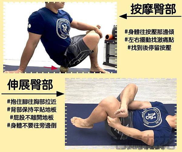 按摩:將球放在照片紅圈處,來回滾動找出激痛點,停留在激痛點上10~20秒,深呼吸,勿憋氣。感覺沒有那麼痠痛後再來回滾動慢慢的按摩肌肉,勿快速滾動。若當中有發現另一個激痛點則同樣停留按壓,重覆幾次至找不到激痛點。