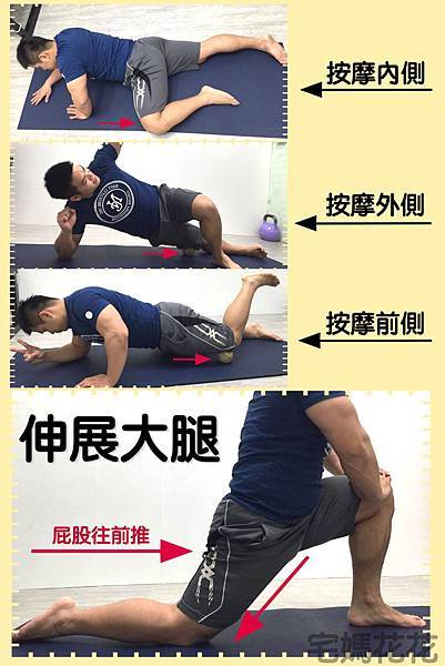 伸展:採高跪姿,右邊膝蓋上緣貼地,臀部往前推而非上半身前傾,此時應感覺右邊大腿前側被拉緊,維持這個姿勢30秒~1分鐘,做深層的呼吸,勿憋氣與彈震。右邊大腿前側伸展完後換腳再拉左邊大腿,每邊重複3~5次。