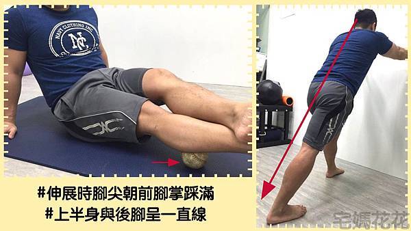 按摩:將球放在照片紅圈處,將按壓處那邊的小腿像翹二郎腿那樣放到另一腳。來回滾動找出激(極)痛點,停在該點上10~20秒,深呼吸,勿憋氣。感覺沒有那麼痠痛後再以來回滾動的方式慢慢的按摩肌肉,勿快速滾動。若當中有發現另一個激痛點則同樣停留按壓,重覆幾次至找不到激痛點。